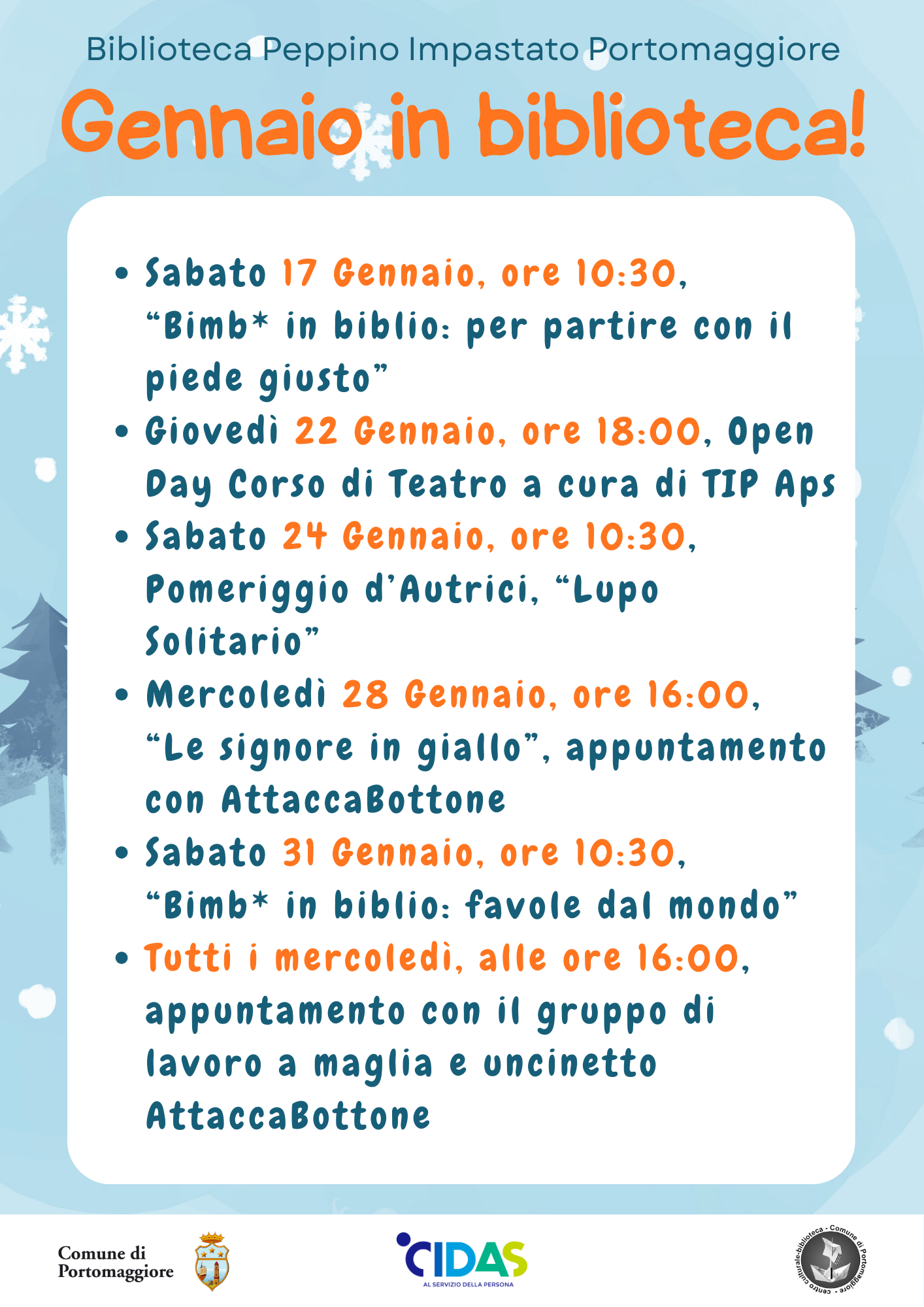 Dopo la pausa delle vacanze natalizie, un ricco programma per bambine e bambini e per adulti vi aspetta in Biblioteca. Sabato 17 gennaio ore 10.30 - Bimbi in biblio: per partire con il piede giusto Giovedì 22 gennaio ore 18.00 - Open Day - Corso di teatro a cura di TIP Aps Sabato 24 gennaio ore 10.30 - Pomeriggio d'autrici "Lupo Solitario" incontro con le autrici Bibi Khudeja e Grazia Satta Mercoledì 28 gennaio ore 16.00 - Le signore in giallo - appuntamento con il Gruppo Attaccabottone Sabato 31 gennaio ore 10.30 - Bimbi in biblio: favole dal mondo.