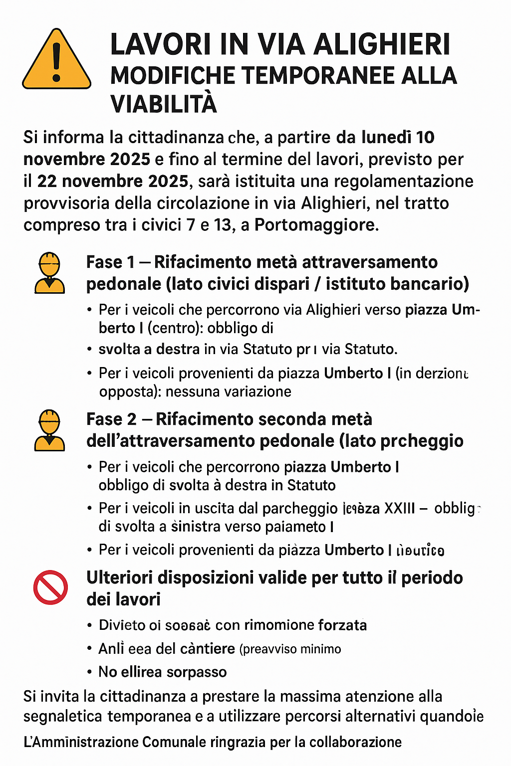 Si informa la cittadinanza che, a partire da lunedì 10 novembre 2025 e fino al termine dei lavori, previsto per il 22 novembre 2025, sarà istituita una regolamentazione provvisoria della circolazione in via Alighieri, nel tratto compreso tra i civici 7 e 13, a Portomaggiore.