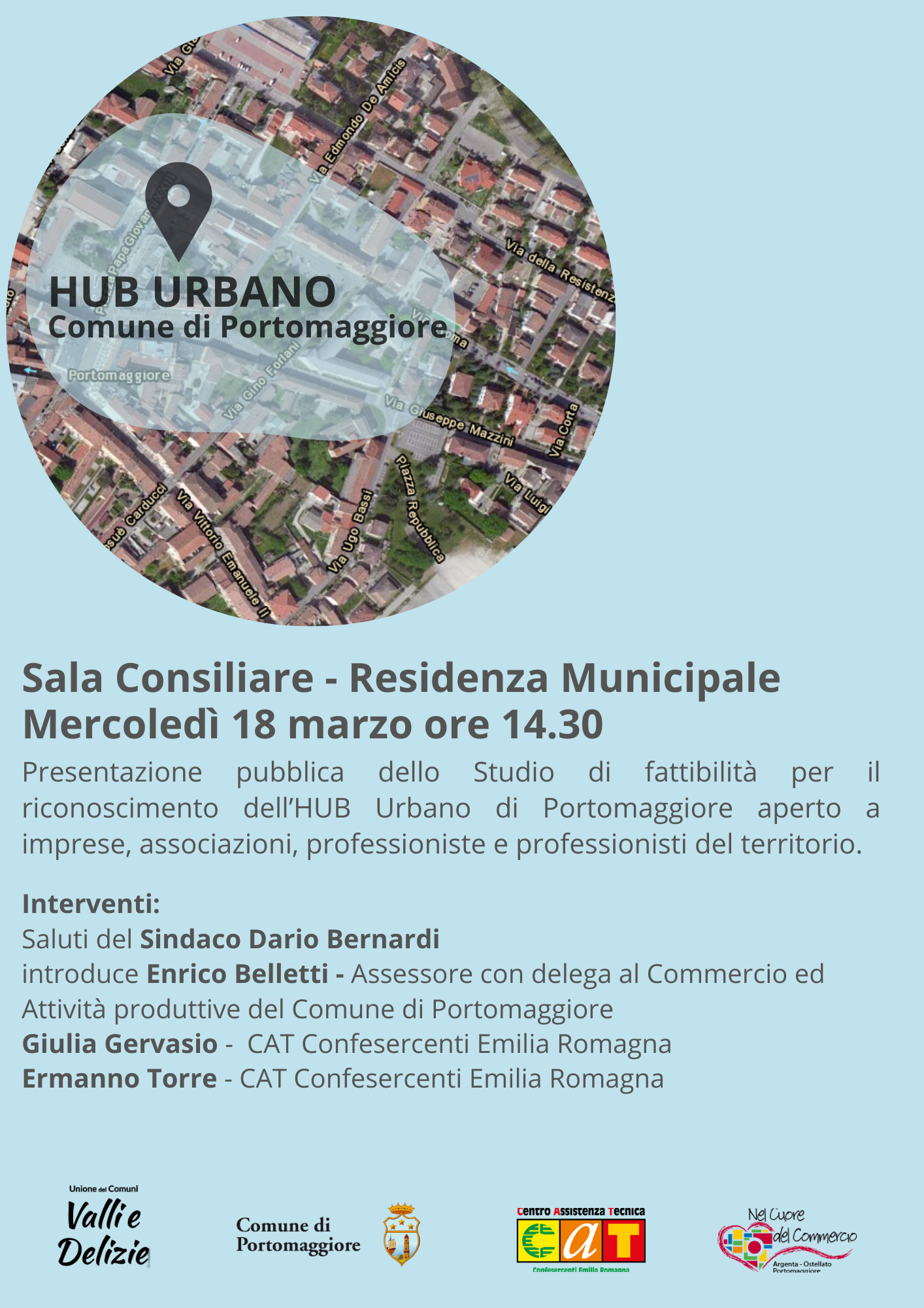 Mercoledì 18 marzo alle ore 14.30 presso la Sala Consiliare - Residenza MuncipialePresentazione pubblica dello Studio di fattibilità per il riconoscimento dell'HUB Urbano di Portomaggiore.